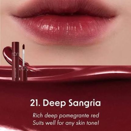 Indulge in the rich, velvety charm of Romand Juicy Lasting Tint 21 Deep Sangria — a deep wine-red shade that adds sophistication to your every look. This tint delivers a glossy, long-lasting finish with intense color payoff, leaving your lips looking plump, hydrated, and irresistibly smooth all day long.